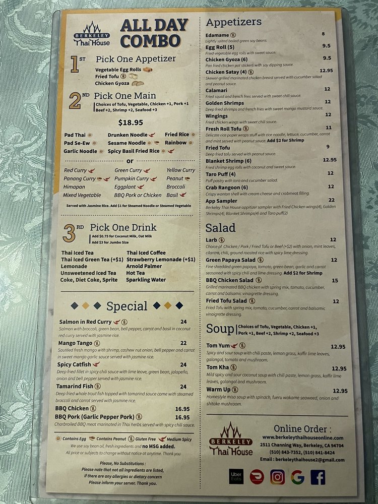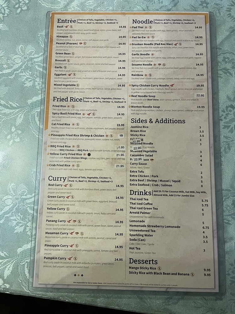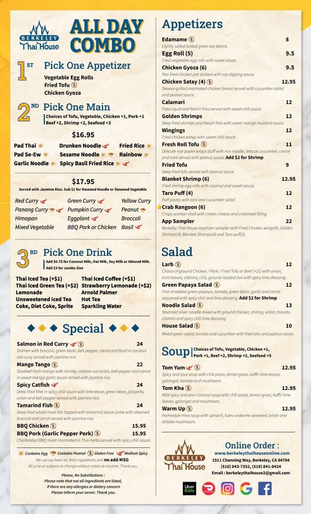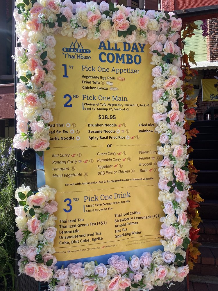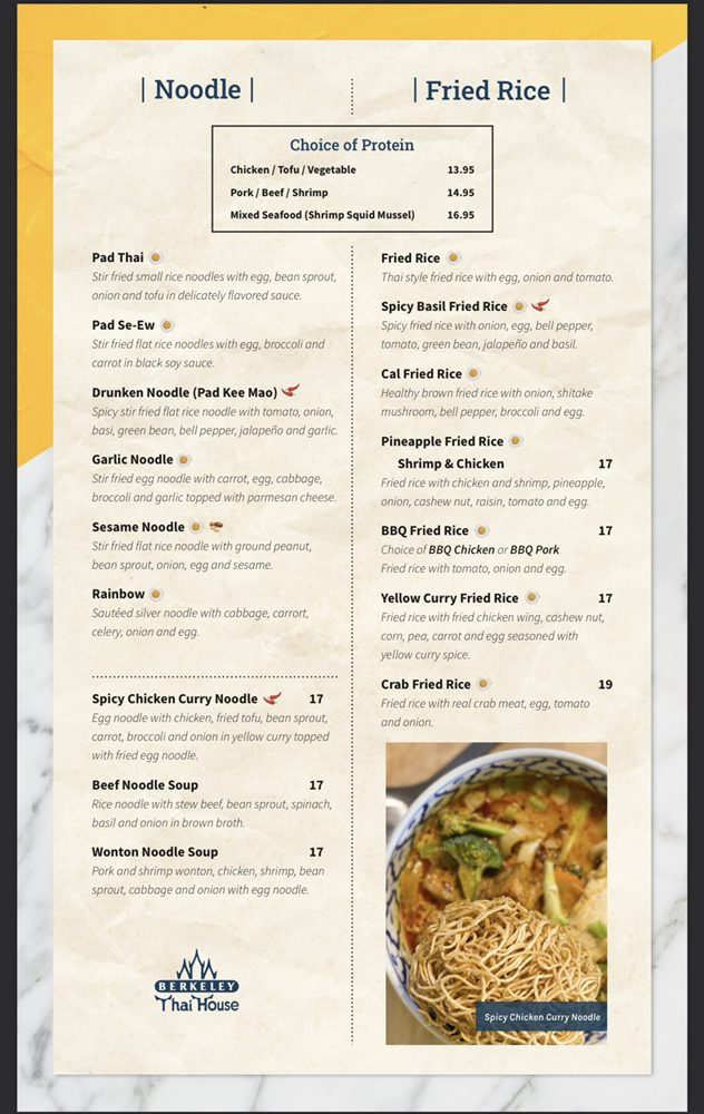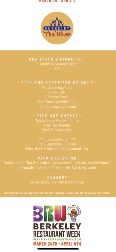 Berkeley Thai House, a vegan Thai restaurant in Berkeley, CA, offers a diverse menu with enticing options like garlic noodles, red curry, sesame noodles, and pad Thai. Customers rave about the flavorful dishes, with highlights including the yellow chicken curry, Thai iced tea, and Drunken noodles. The combo meals, which include an entree, appetizer, and drink, are a popular choice for value and variety. The restaurant's cute ambiance makes it a great spot for dates or casual outings with friends and family. With friendly service and a wide range of vegetarian options, Berkeley Thai House is a must-visit for lovers of authentic Thai cuisine and those looking for a satisfying meal in a welcoming atmosphere. Make sure to try their rainbow noodles and potstickers for a unique and delicious dining experience.